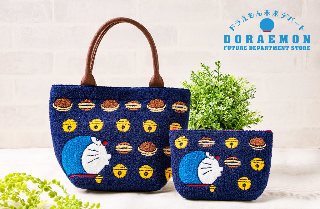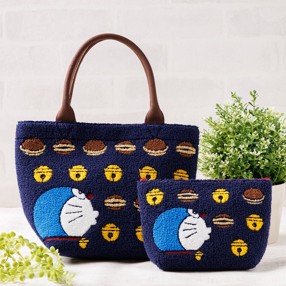 ドラえもんの横顔と大好物のどら焼きや鈴を、もこもこのサガラ刺しゅうでデザインしたトートバッグと舟形ポーチです。いずれも背面はしっかりとした厚めのキャンバス生地で、トートバッグには内ポケットと、開閉部分にマグネットボタンが付いています。