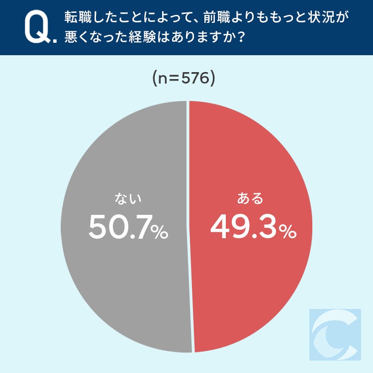 49.3%とほぼ半数が、転職して「前職よりも状況が悪くなった経験がある」と回答しています。