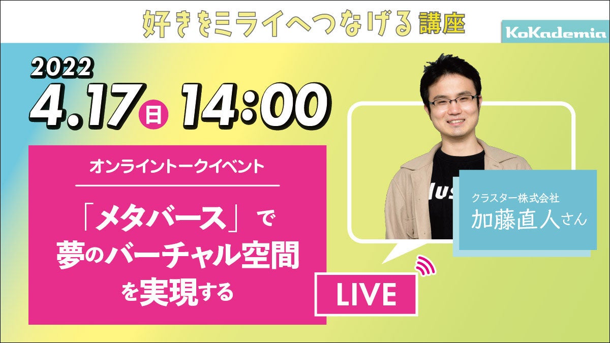 雑誌『子供の科学』を出版する株式会社誠文堂新光社(東京都文京区)は、2022年4月17日(日)に中高生向けのオンライントークライブイベント「好きをミライへつなげる講座」を開催。バーチャル空間「メタバース」のプラットフォーム「cluster」を開発した今注目の経営者、クラスター株式会社の加藤直人さんが登場します。