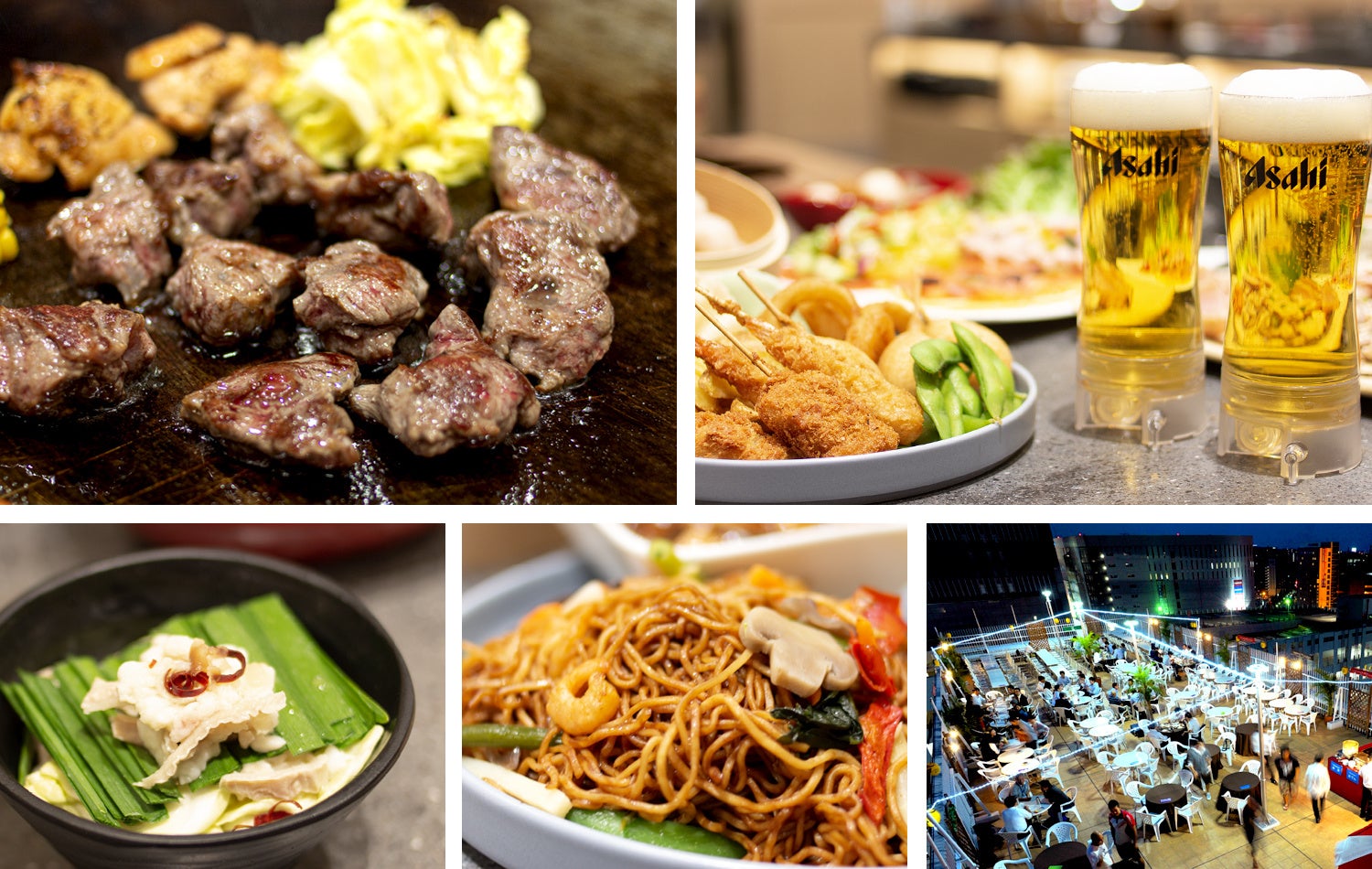 鉄板焼き(ビーフ・チキン・ソーセージ・野菜)/ 担々麵 / 飲茶(海老焼売・ポーク焼売)/ おでん(大根・卵・こんにゃく・厚揚げ)/ 博多もつ鍋 / 海鮮お好み焼き / 唐揚げ / フライドポテト / オニオンリング / 麻婆豆腐 / 上海焼きそば / 串揚げ(プチドック・豚・海老・蓮根)/ ビーフカレー / 枝豆 / イカ(炭火焼き) / 刺身 / カツオのたたき / 酢モツ / スモークサーモン / 糸島葱入り卵焼き 明太マヨネーズ / イタリアンハムのマリネ / キムチ / ナムル / プチトマト / ミックスレタス / ポテトサラダ / 乾き物(柿の種・ポテトチップス・牛蒡チップス・ミックスナッツ・タコスチップス)/ 杏仁豆腐 / アイスクリーム / 中華ポテト など