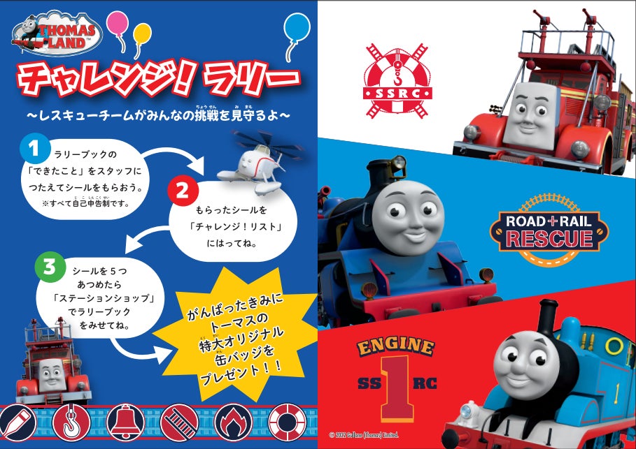 トーマスランド内で8つの項目に挑戦しシールを集めてまわる「チャレンジ!ラリー」を開催。「アトラクションにのろう」、「残さず食べよう」など、園内を楽しみながら気軽に参加できる内容となっております。また、8つの項目の内シールを5枚集めてくれたお子様には、特大オリジナル缶バッジをプレゼント。この夏は、トーマスランドで楽しみながらお子様の挑戦や成長を見守ってみてはいかがでしょうか。