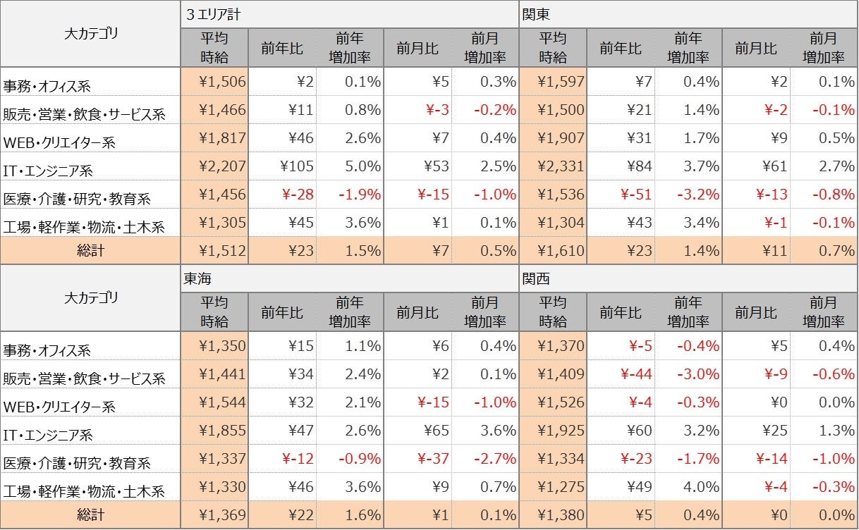 エリア別の平均時給について、関東エリアは1,610円(前年比+23円、前月比+11円)、東海エリアは1,369円(前年比+22円、前月比+1円)、関西エリアは1,380円(前年比+5円、前月比±0円)となりました。