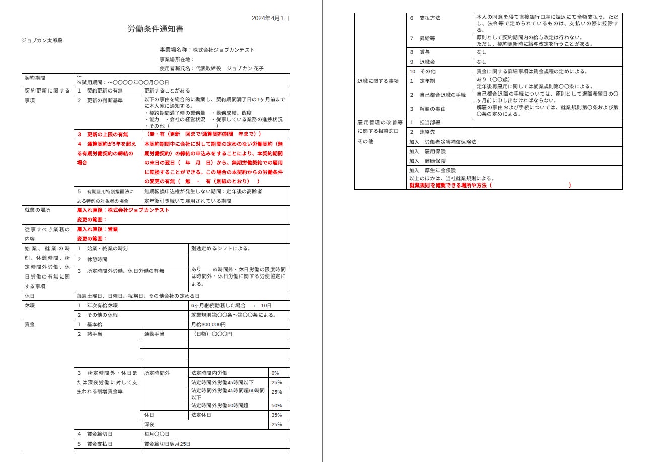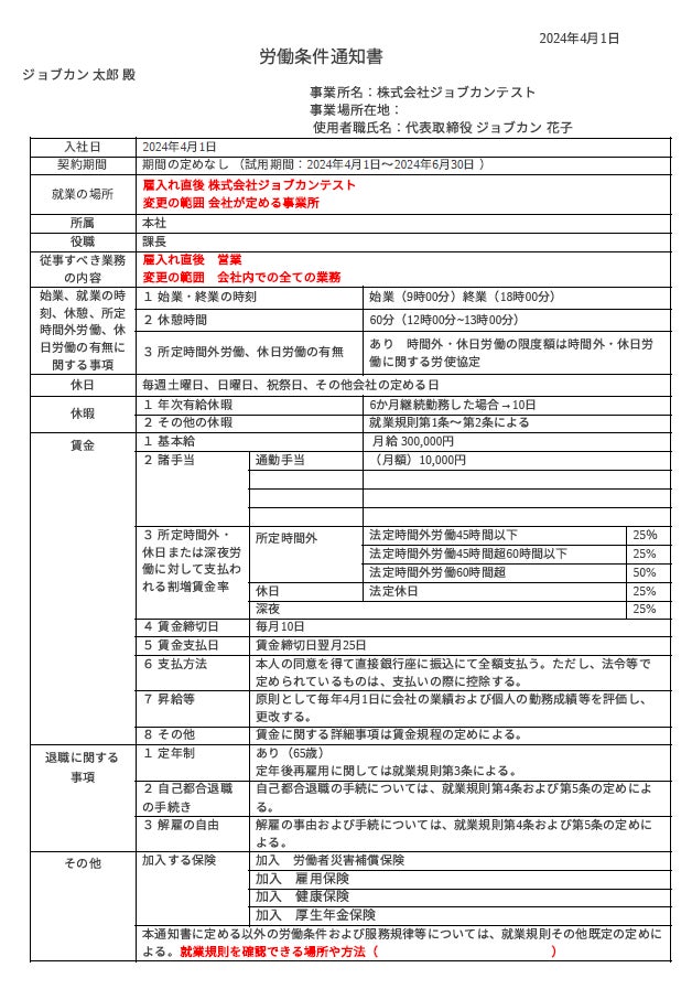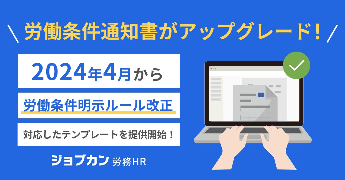 株式会社DONUTS(東京都渋谷区、代表取締役:西村啓成)が提供するバックオフィス支援クラウド人事労務システム『ジョブカン労務HR』は、2024年4月1日に施行される「労働基準法施行規則改正」に含まれる「労働条件明示ルールの変更」に伴い、システム内でダウンロード可能な労働条件通知書のテンプレートを改修し、新ルールに対応したテンプレートの提供を開始しました。新しい労働条件通知書のテンプレートは、4月1日前の雇用契約にも利用可能です。