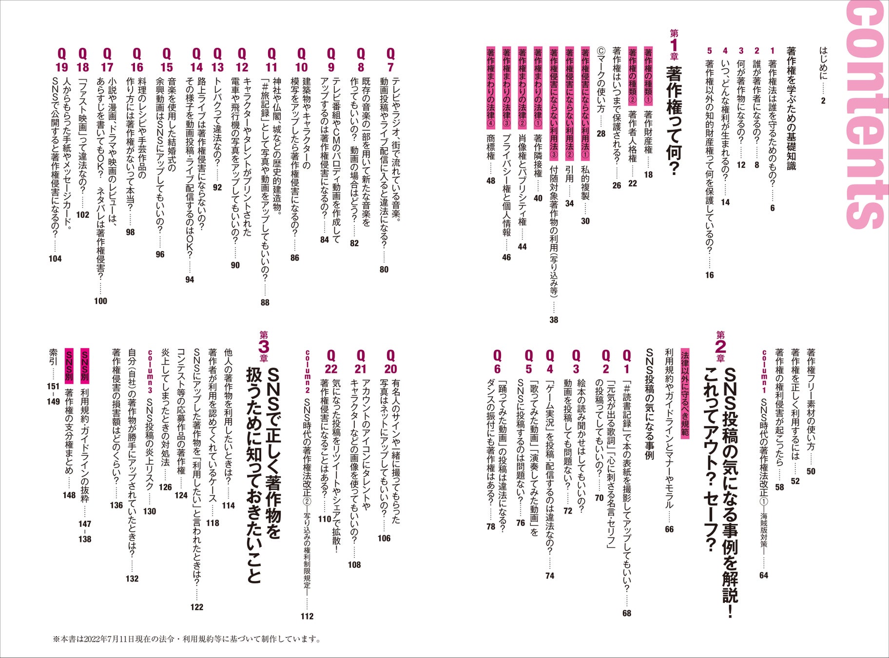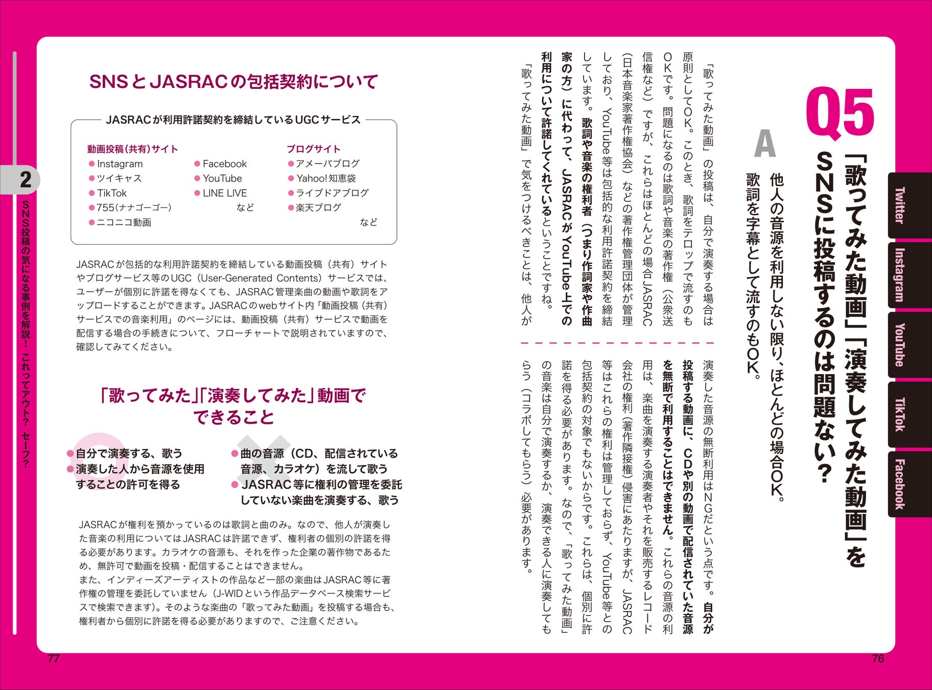 「アイコンにタレント使用OK?」「ネタバレは違法になる?」「ゲーム実況はグレー?」「歌ってみたがOKの理由は?」「建築物の写り込みは大丈夫?」など、誰もが気になる項目について、どのような法解釈によって判断されるのか詳しく深掘りしています。