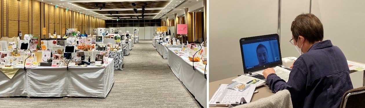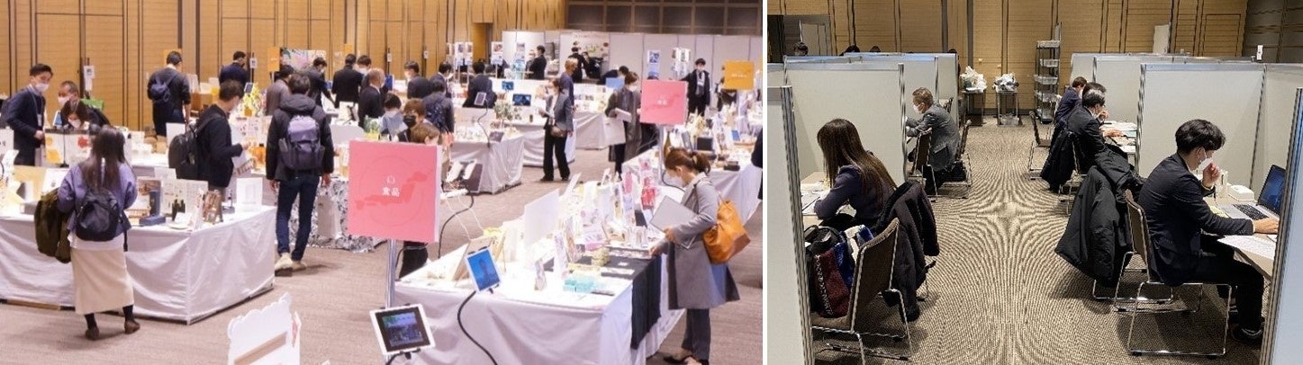 会場は、商品のみをショールーム型で展示し、バイヤーと出展者はオンラインで商談を行う「リアルとオンラインのハイブリッド展示商談会」です。