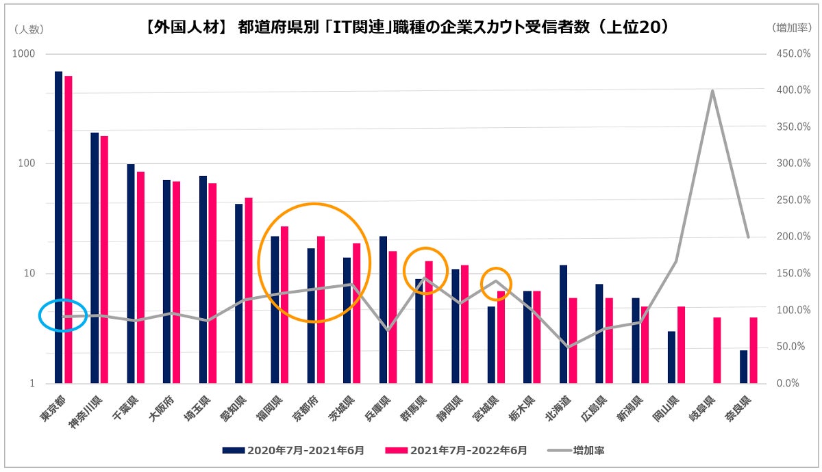 1.外国籍人材「IT関連」職種は、前年同期間と比べ大都市以外の地域で企業から求職者へのスカウト数が増加した
