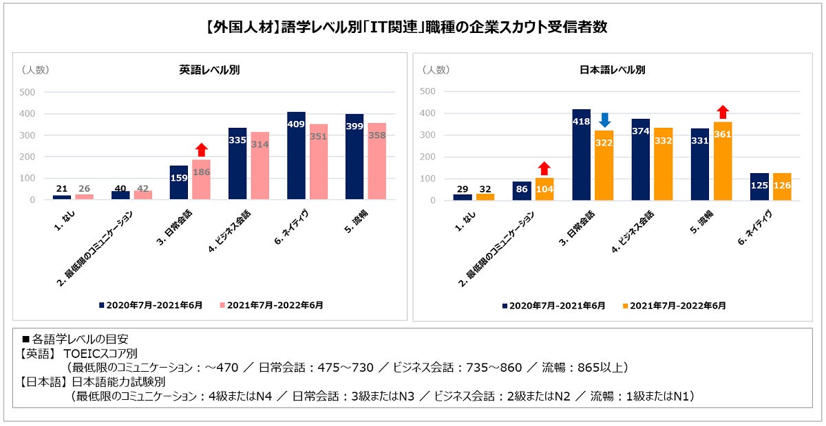 | ■外国籍人材「IT関連」職種は、前年同期間と比べ大都市以外の地域で企業から求職者へのスカウト数(※1)が増加 ■多くの世界的IT企業を輩出する中国のIT人材ニーズが大幅に増加 ■語学力別では、日本語「最低限のコミュニケーション」「流暢」「ネイティヴ」レベルが増加  |