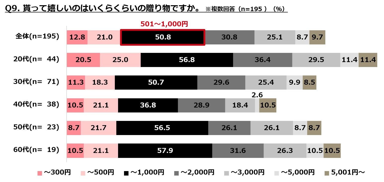 ・貰って嬉しい贈り物の金額は「~1,000円」が5割で最多で、次いで「~2,000円」が3割。