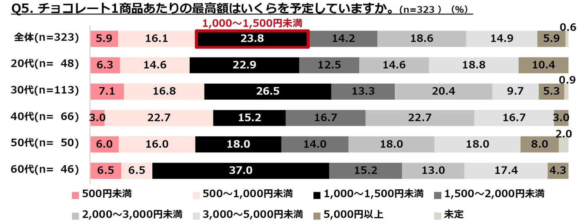 毎年恒例のバレンタイン調査。今年購入予定のチョコレート1商品あたりの最高額は買う側の女性では「1000~1500円未満」が最多の24%。一概に比較はできませんが、昨年の調査では「2000~3000円未満」でしたので、1商品あたりにかける額はやや減少傾向にあるのかもしれません。