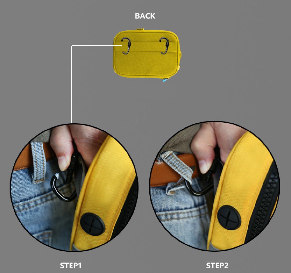 背面バンドにカラビナを設置して、ベルト穴に設置してください。