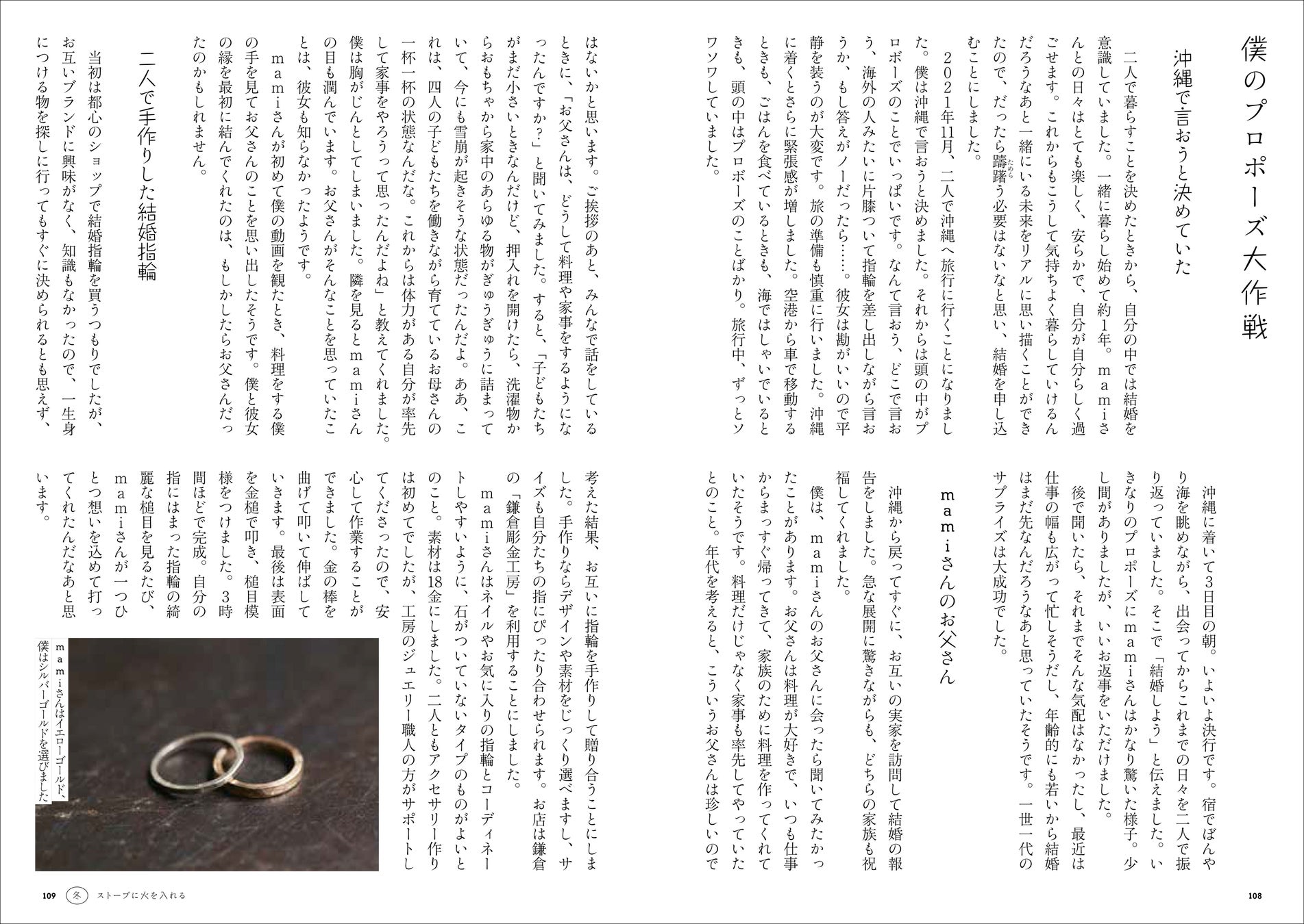 アラジンと焼き芋/愛しの黒千石大豆/僕のプロポーズ大作戦/二人暮らしのお金事情。あのときの僕の決断/ポカポカの床とジンジャーシロップ/二人暮らしの料理事情。気遣いに気づかない奥平/物選びにこだわりのあるmamiさんへの誕生日プレゼント/冬のおもてなし―久しく会っていなかった元上の階の住人がやってきた/手作りアメリカンフード/イベントは全力投球。すべては思い出作りのために