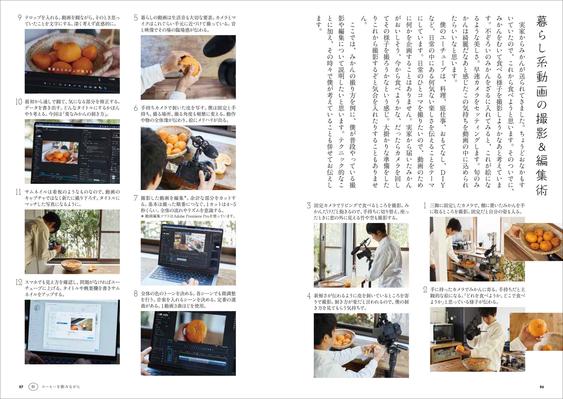 ますますはまるコーヒーの世界/三つの淹れ方でコーヒーを飲み比べ/秋の味覚狩り。庭で拾った栗でモンブラン作り/収納は二人で押入れ一間分。自分の中の「ジャイアン気質」/目に見えるところに商品パッケージは置かない/気付いたら自分で作った器がほとんどだった/お遊び金継ぎ―美しく生まれ変わる魔法/mamiさんから見た二人暮らしの実情/暮らし系動画の撮影&編集術/ユーチューバーの仕事道具/奥平家のこと/自分のブランド「ki duki」について/底を空洞にしたグラス「uku」ができるまで/秋の夜長におうちシアター/秋のおもてなし―視聴者のmasaさんがやってきた/客人の好みに合わせて和のおもてなし/自由時間が増えた僕、そうでもないmamiさん