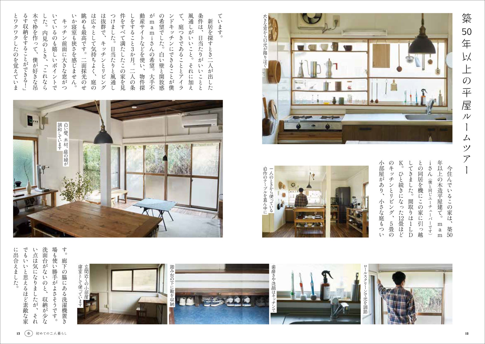 和朝食で始まるモーニングルーティン/築50年以上の平屋ルームツアー/季節や気分に合わせて、食事・仕事・寝る場所を移動する/釘を使わないDIY/キッチン収納は、使いやすさと見た目のすっきり感を意識/計測に始まり、やすりがけに終わる/キャンプ先で二人暮らしの相談/自宅の庭でよもぎ摘み。失敗するのが好きな理由/収穫したよもぎで、お餅とパン作り/引っ越すときに手放したもの/愛用の鍋とフライパン/普段使いの食材/こだわりの調味料/春のおもてなし―子どものころからテレビで見ていたあの人がやってきた/僕の定番を食べてほしくて/古さと不便さを楽しむ暮らし