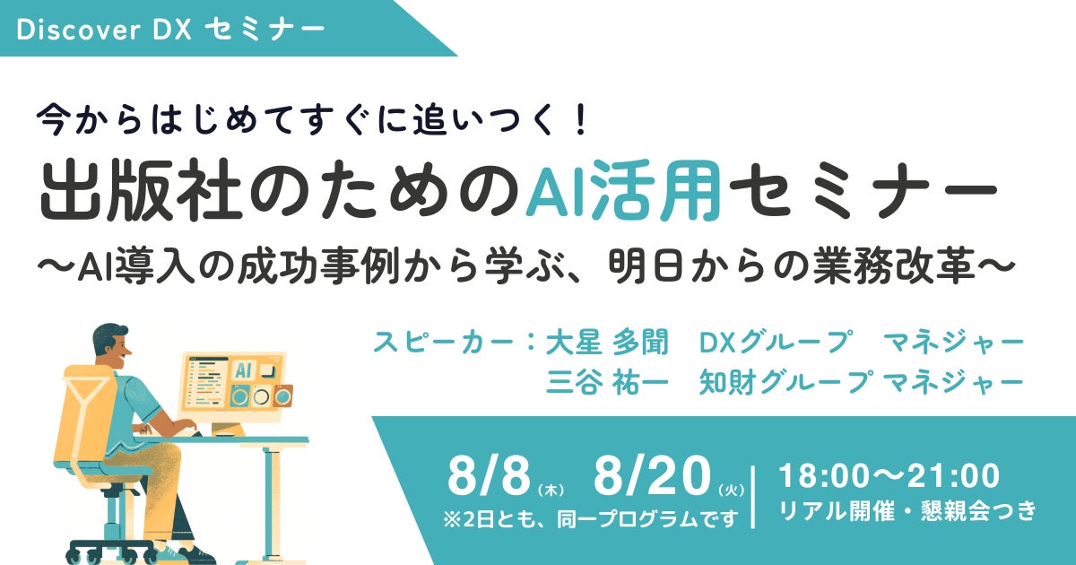 株式会社ディスカヴァー・トゥエンティワン(本社:東京都千代田区、代表取締役兼社長執行役員:谷口奈緒美)は、2024年8月8日(木)ならびに8月20日(火)に、出版業界向けにAI活用セミナーを開催します。セミナーでは、AI導入の成功事例や具体的な活用ステップ、著作権に関する最新情報を提供します。