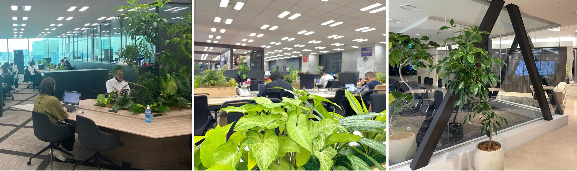 このような中、当社はさらなる生産性・創造性向上、「社員幸福度No.1」を実現させるべく、2022年9月より全国35のオフィスで視界に占める緑の割合(緑視率)10-15%を目安に観葉植物を設置しています。