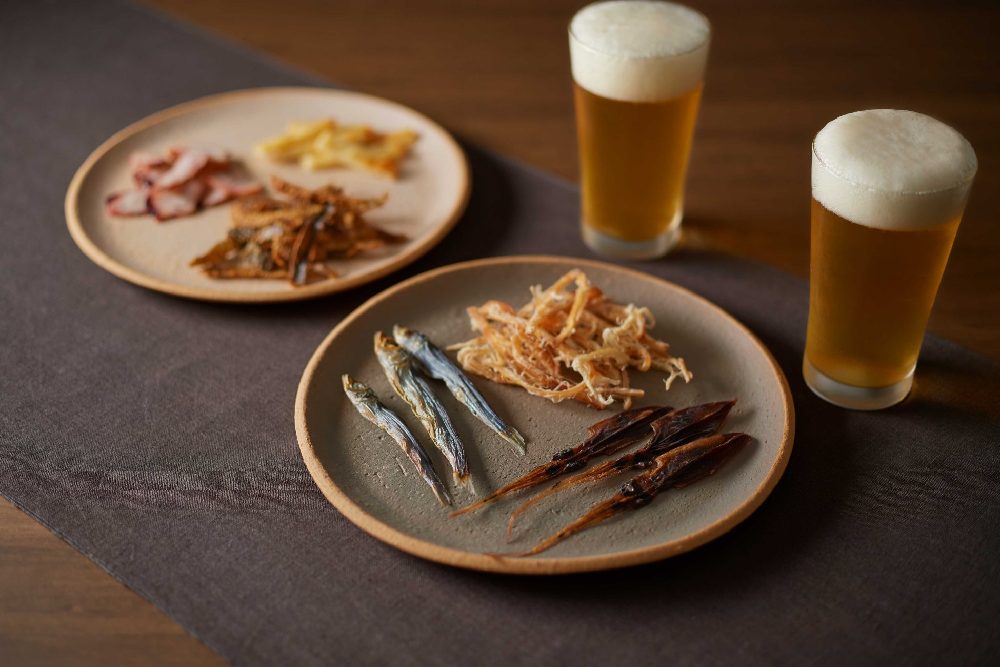 「鮭皮チップス」は北海道産の鮭を使用した鮭とばの加工時に裁断される皮の部分で作ったおつまみです。通常は使用されないことが多い端材を活用しています。食べやすいように揚げており、香ばしい風味とカリっとした軽い食感を楽しむことができます。「ほたるいかのいしる干し」は、日本海沿岸で獲れたほたるいかを使用し、北陸地方に伝わる伝統的な魚醤「いしる」に漬けて干したものです。「皮つきさきいか」と「焼きうるめいわし」は国産素材を使用し、素材の旨味を生かして仕上げました。