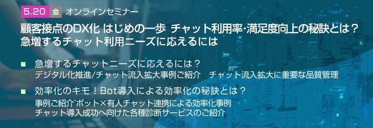 トランスコスモス株式会社(本社:東京都豊島区、代表取締役社長兼COO:奥田昌孝)は、オンラインセミナー顧客接点のDX化 はじめの一歩。 チャット利用率・満足度向上の秘訣とは?を5月20日(金)に開催します。