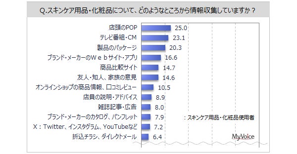 スキンケア用品・化粧品の情報源は(複数回答)、「店頭のPOP」「テレビ番組・CM」「製品のパッケージ」が使用者の各20%台です。