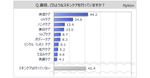 ■行っているスキンケアは「保湿ケア」が4割強、「UVケア」が約25%、「ハンドケア」「美白ケア」が各1割強。使用しているスキンケア用品は「洗顔料」が6割弱、「化粧水、ローション」が4割強