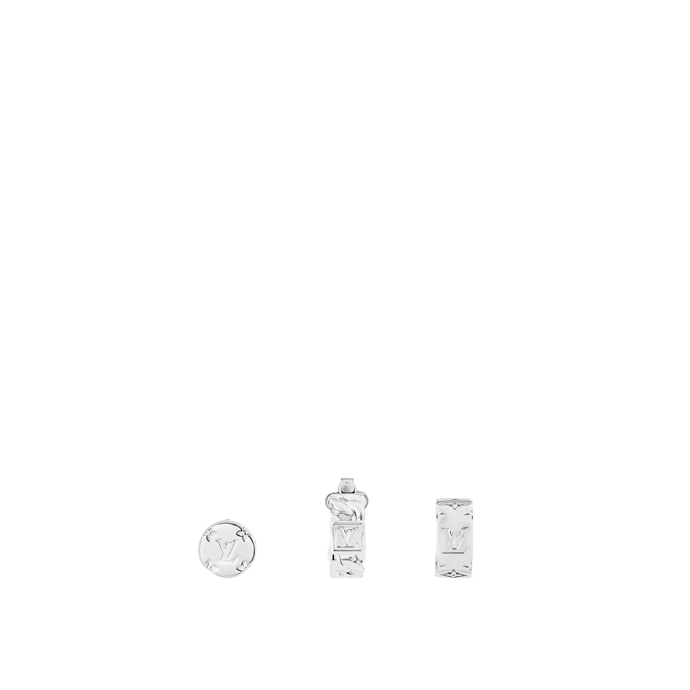 さまざまなスタイリングが楽しめる「ピアス·LV モザイク セット3」。アーティスティックに組み合わせられるピアスとイヤーカフをシルバーカラーのメタルで模り、それぞれにシグネチャーの刻印を精緻に施しました。単体やセットでの着用はもちろん、他のアイテムと組み合わせることで装いにエッジィな個性を添えるアクセサリーです。