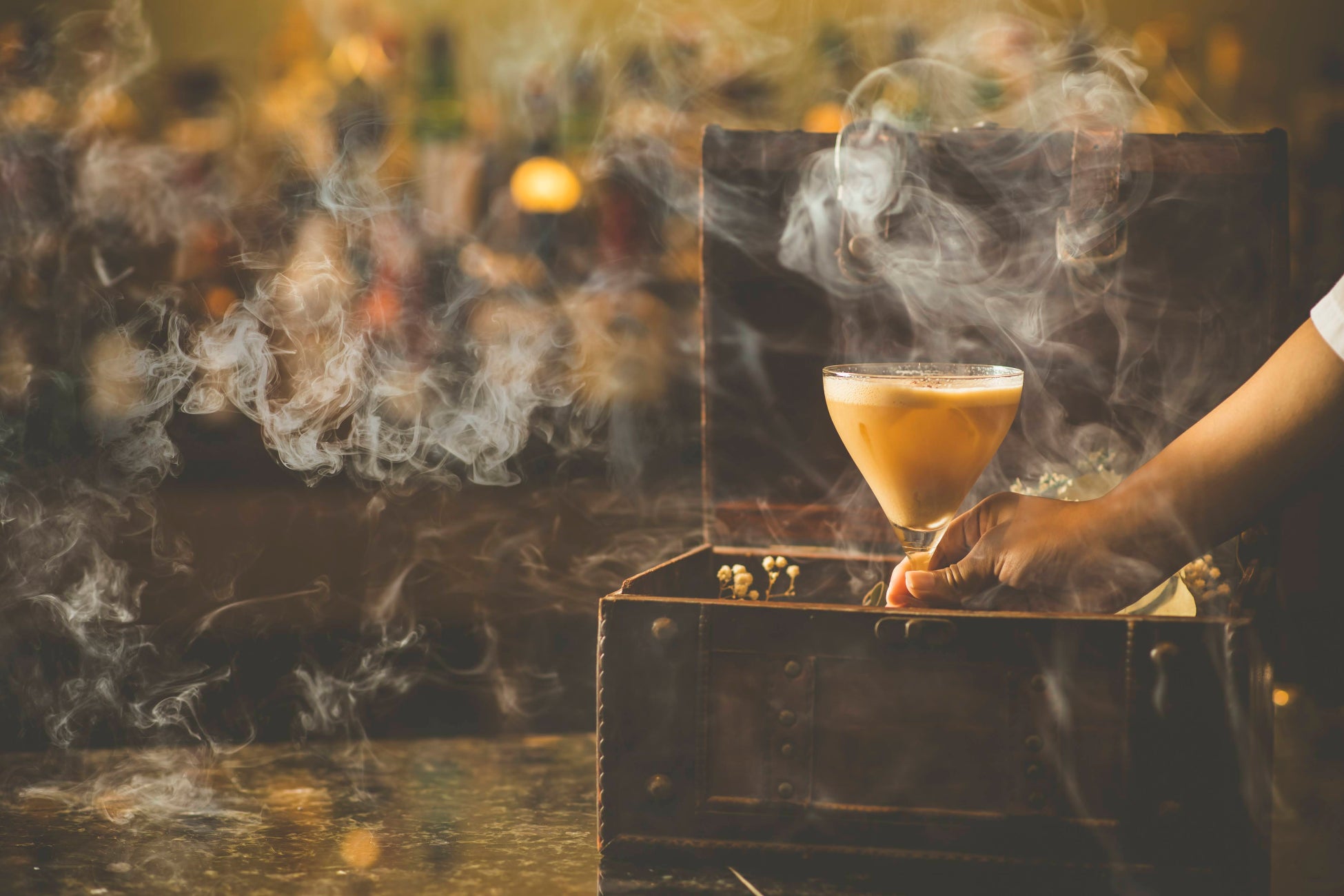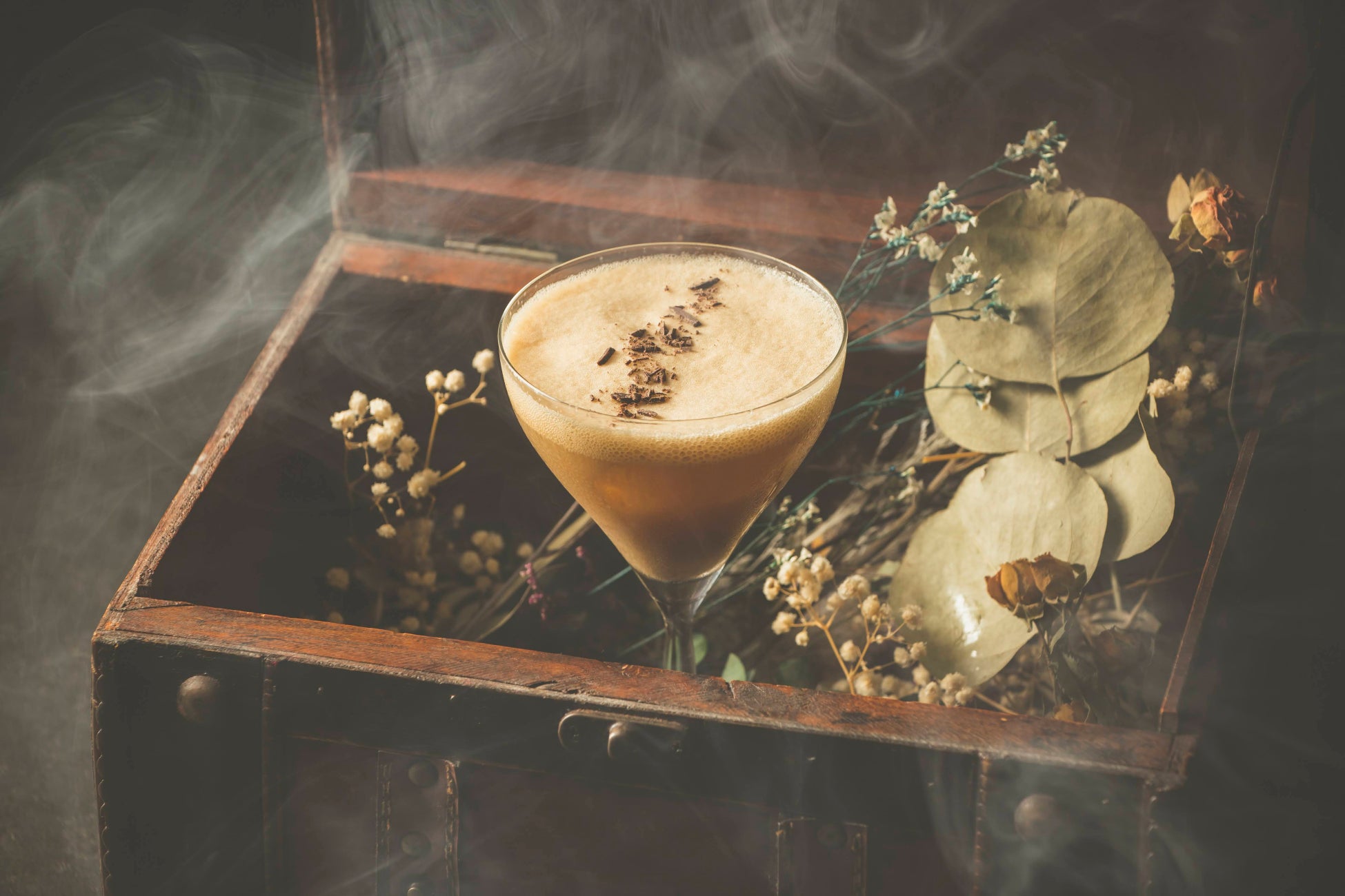 珈琲、泡盛、カカオのそれぞれのニュアンスの違うロースト香に燻製の香りを纏わせたカクテル。