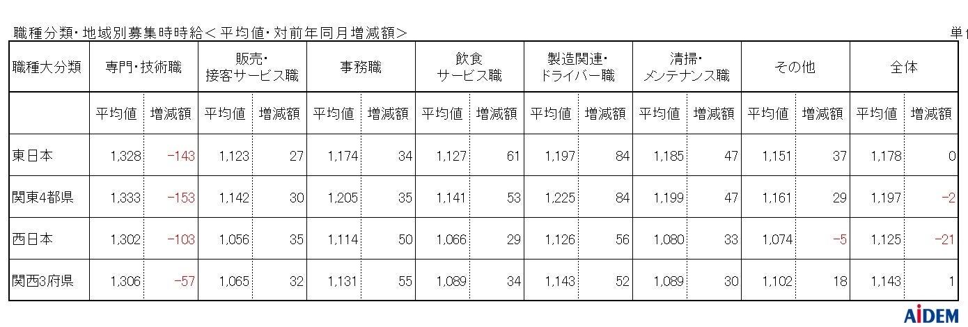 職種大分類別の平均時給は、「専門・技術職」1,306円(前年同月比57円減)、「製造関連・ドライバー職」1,143円(同52円増)、「事務職」1,131円(同55円増)、「飲食サービス職」1,089円(同34円増)、「清掃・メンテナンス職」1,089円(同30円増)、「販売・接客サービス職」1,065円(同32円増)の順で、前年同月比でプラスが5職種、マイナスが1職種となった。府県別の平均時給は、大阪府1,184円(前年同月比8円増)、京都府1,107円(同4円増)、兵庫県1,093円(同10円減)の順となり、前年同月比でプラスが2府、マイナスが1県となった。