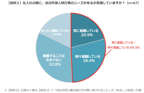「常に意識している」20.9%、「時々意識している」28.4%と、合わせて49.3%が外国人旅行者向けの仕入れを意識している結果となりました。