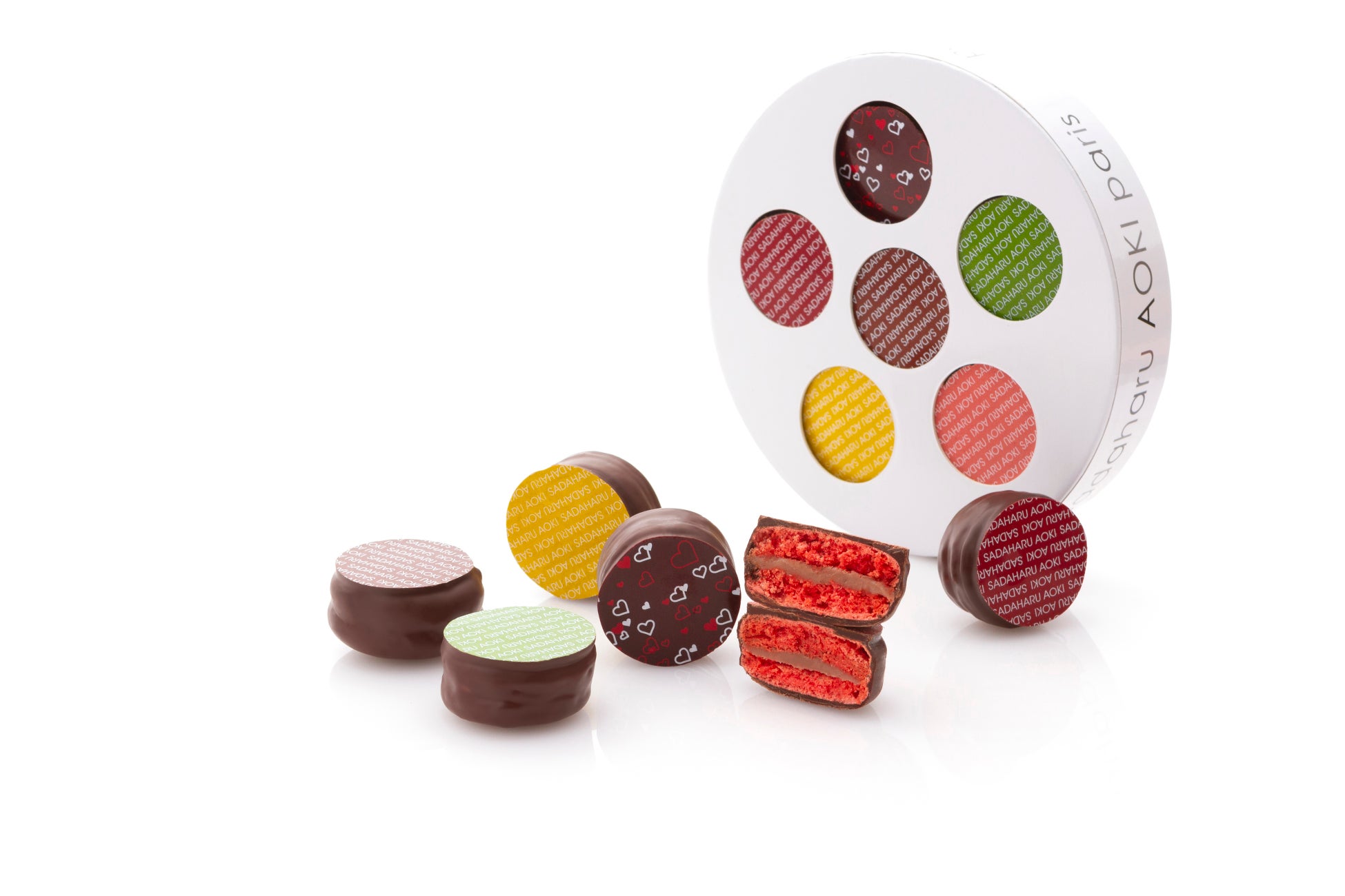 スペイン産アーモンドや愛知県「南山園」の抹茶など、こだわりの素材を使用したアオキの看板商品であるマカロンを濃厚なショコラで包みました。