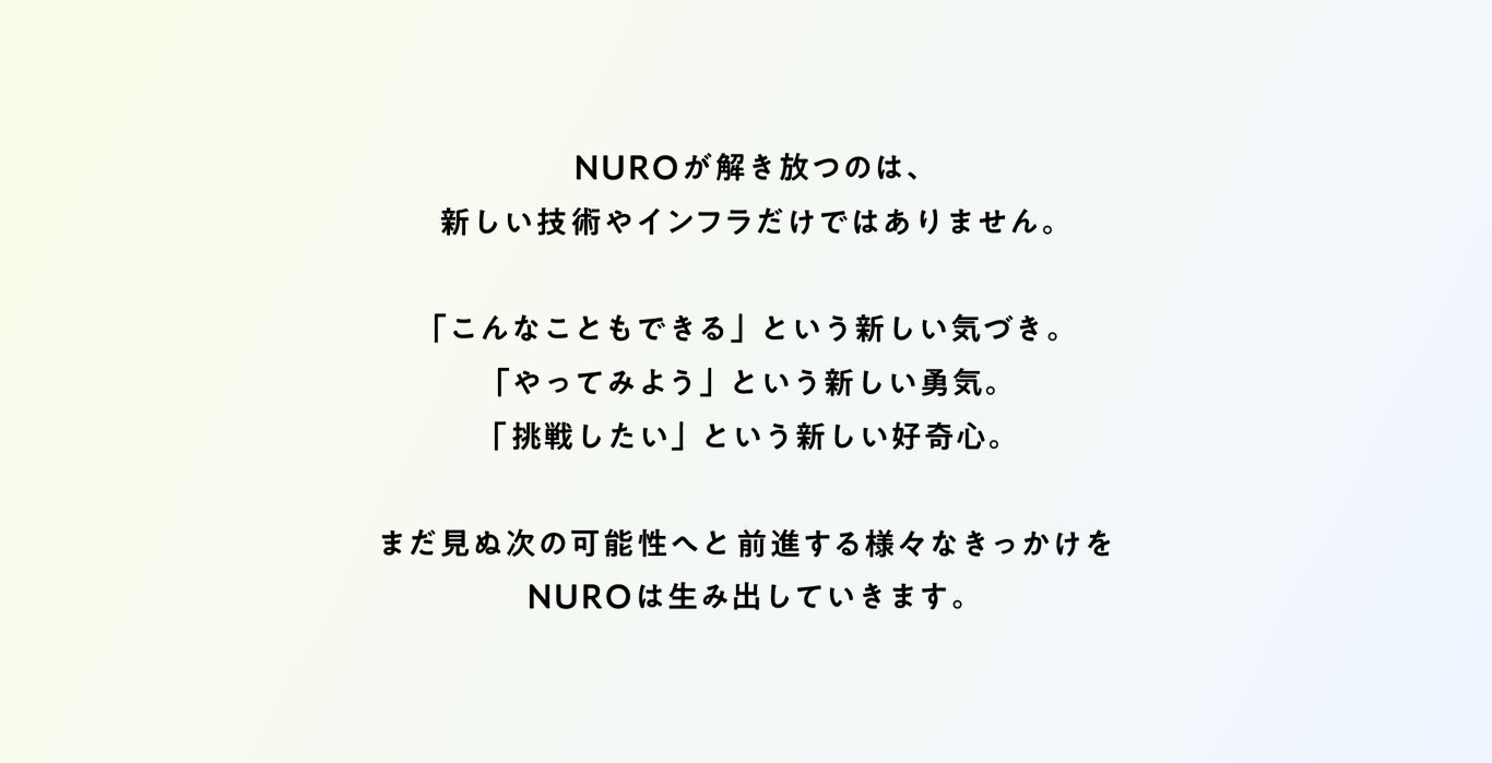 「NURO」は、新しいことへチャレンジする人や企業を支え、新たな可能性へ前進させる、挑戦を後押しするブランドでありたいと考えています。そのために、自らも変化し、世の中を一歩先へ進めていくための挑戦を続けます。今後も、「NURO」ブランド内のサービス連携を加速させることで新たな価値を生み出し、お客さまの未来に向けた様々なきっかけを提供してまいります。