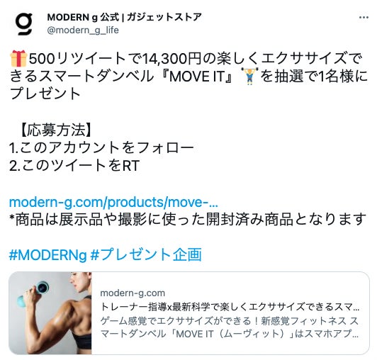 【14,300円の最新科学で楽しくエクササイズできるスマートダンベル『MOVE IT』をプレゼント!】MODERN gの公式Twitterで毎日ギブアウェイキャンペーン中!