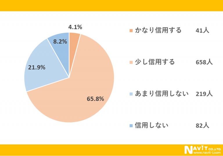 「口コミサイトの情報を信用しますか?」という質問については、「かなり信用する」が4.1%、「少し信用する」が65.8%という結果になり、合わせると69.9%の人が信用していることが分かりました。