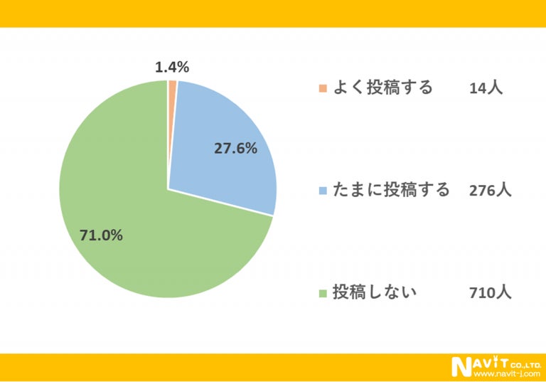 「口コミサイトへ投稿をしますか?」という質問については、「よく投稿する」が1.4%、「たまに投稿する」が27.6%という結果になり、合わせると29.0%の人が口コミサイトに投稿していることが分かりました。