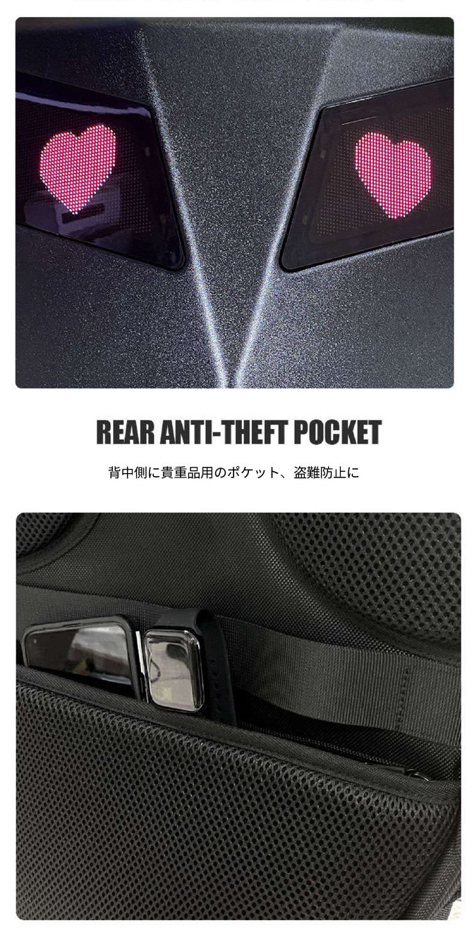 スマホアプリでLEDを自在にカスタマイズ/アニメーションやテキストを表示/大容量/盗難防止ポケット付/夜道の安全に