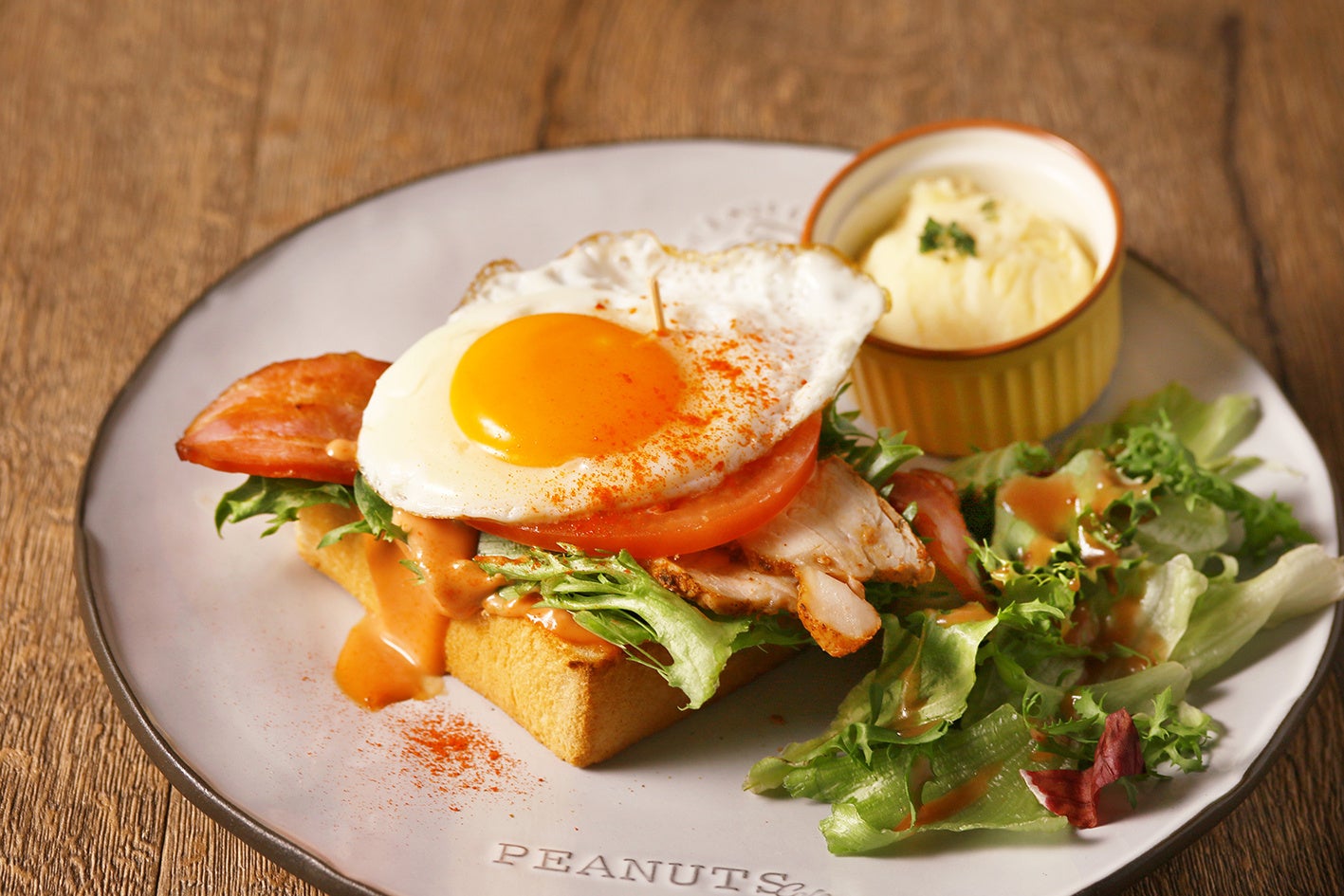 スパイスでマリネした鶏むね肉とカリっと焼いたベーコン、シャキシャキレタスやトマトでボリューム満点のトースト。とろーり卵をたっぷり絡めて、ナイフとフォークでパクリ!が、PEANUTS Cafeだけの楽しみ方。