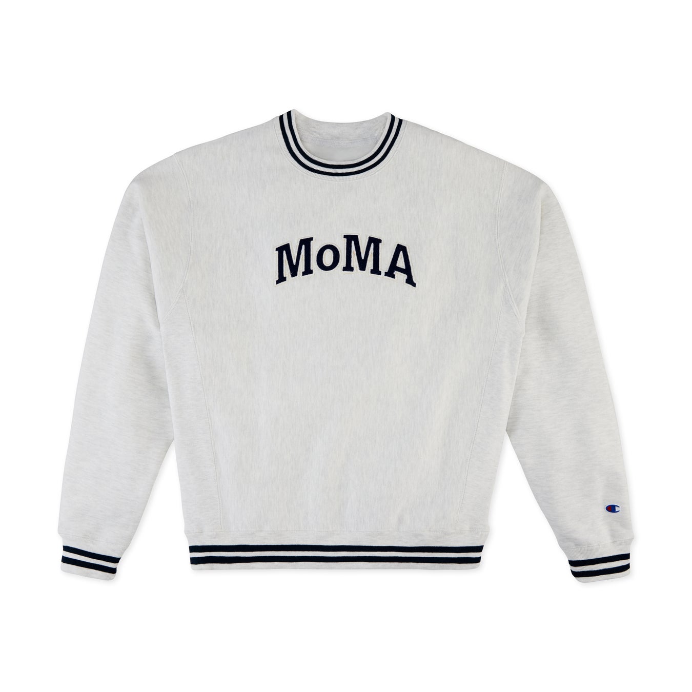 MoMA Exclusive:綿混紡糸を先染めしたリバースウィーブ生地のスウェットシャツは、カレッジスポーツの必須アイテムを思わせます。首元、袖口、ウエストバンドにはストライプを入れ、胸全体にMoMAのロゴをあしらっています。