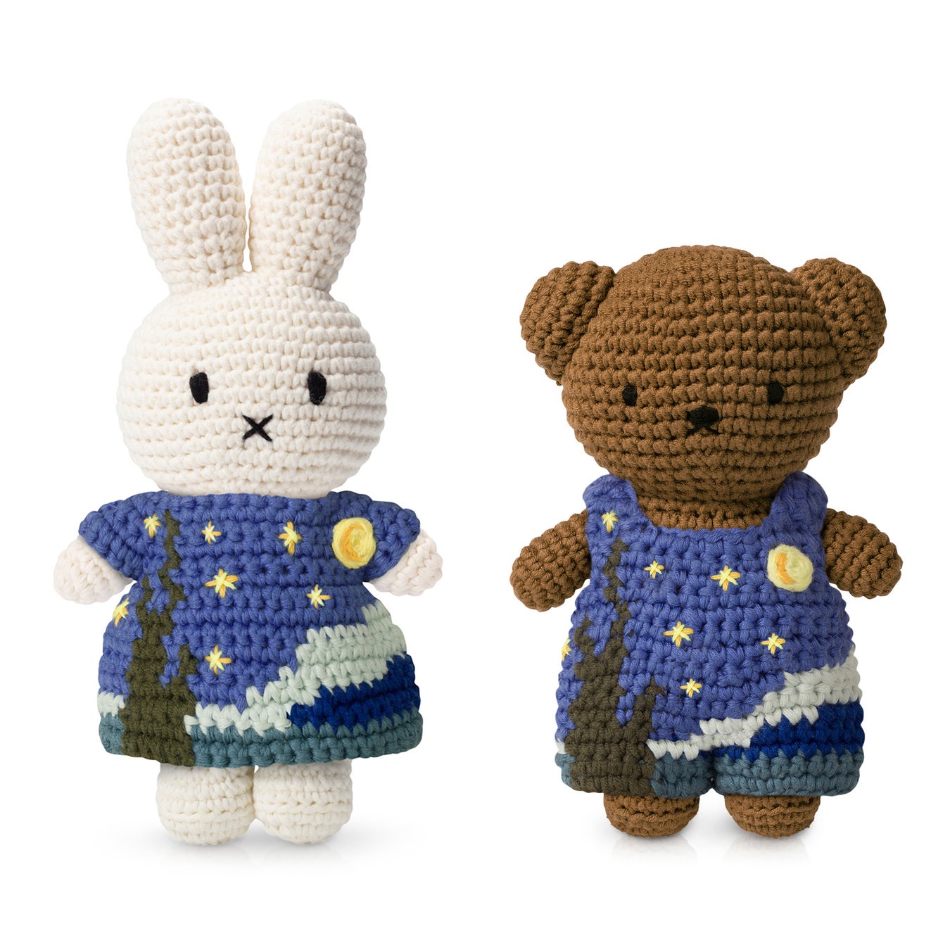 MoMA Exclusive:ミッフィーと仲間たちの編みぐるみが、フィンセント・ファン・ゴッホの代表作『The Starry Night』(星月夜)にインスパイアされたドレスを着て登場します。なめらかなコットンをかぎ針編みしてキャラクターを模り、目の部分は刺繍で表現しています。