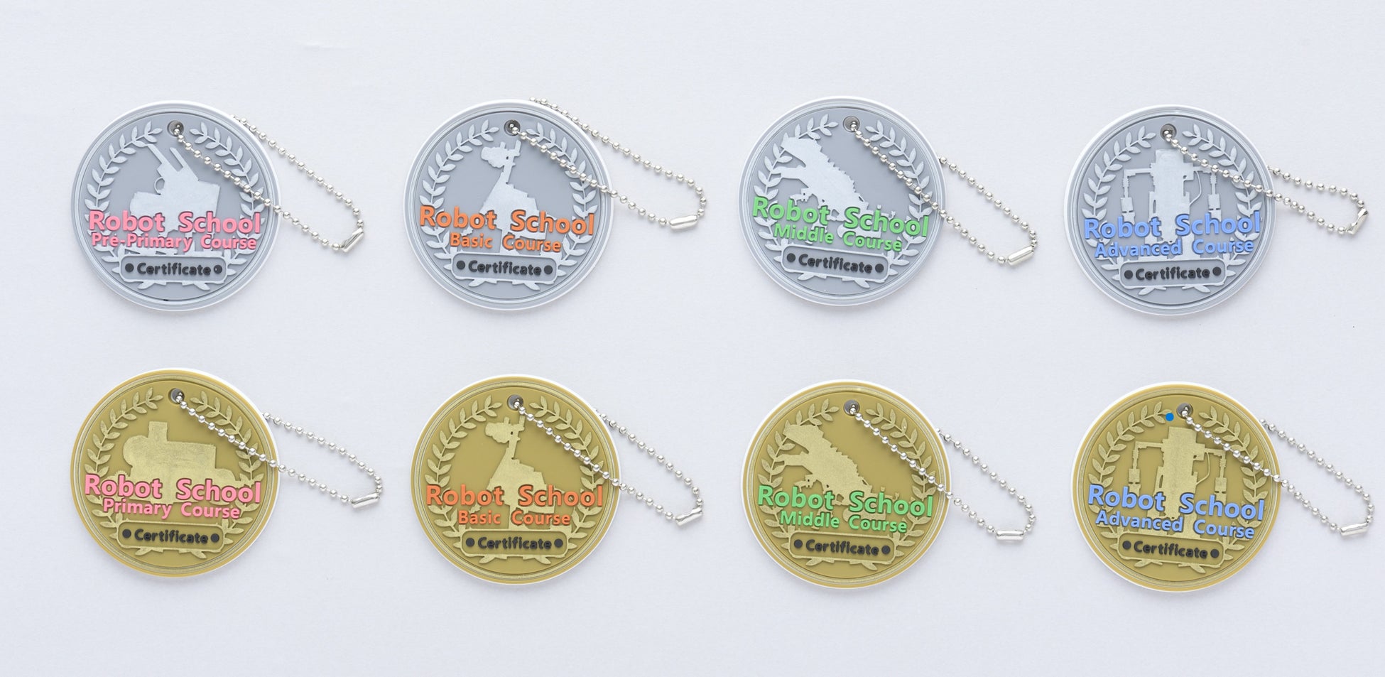 さらに検定後は各回異なるデザインの修了証とメダル型キーホルダーをプレゼント。全部集めると8種類のロボットデザインが勢ぞろいします。お子さまの達成感につなげ、さらなる成長を応援します。