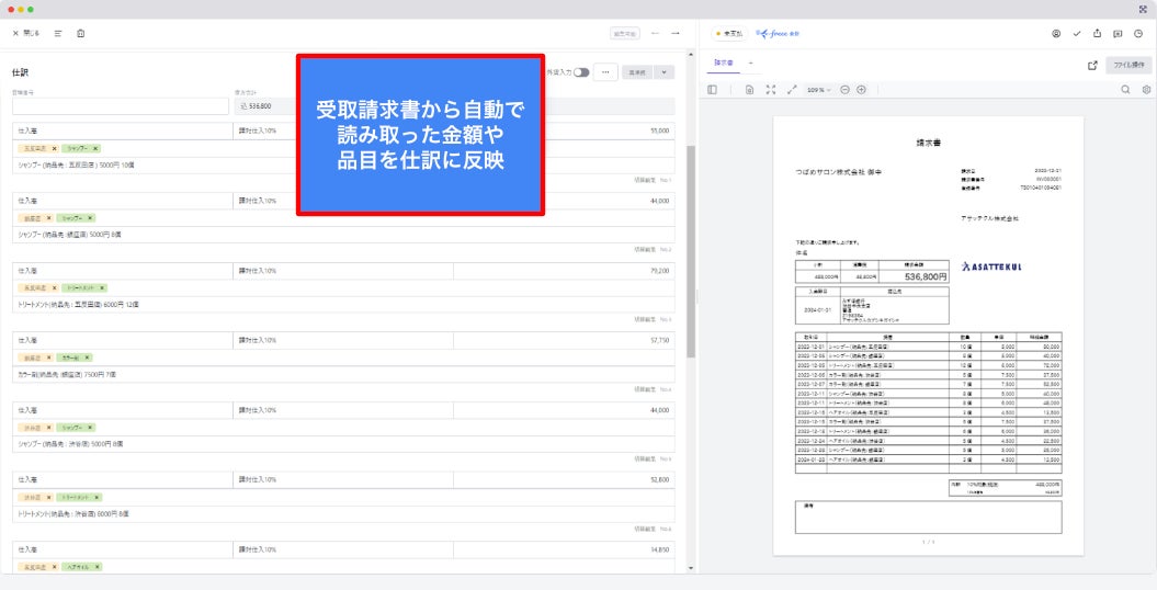 今回の機能により、「freee支出管理 受取請求書」でメールや専用Webサイト、スキャン代行、外部ストレージ連携で請求書を受け取ると、1枚の請求書に対し複数明細行の明細内容(項目、単価、数量、金額)をAI-OCRが自動で読み取り明細仕訳を一括で入力し仕訳入力することが可能です。