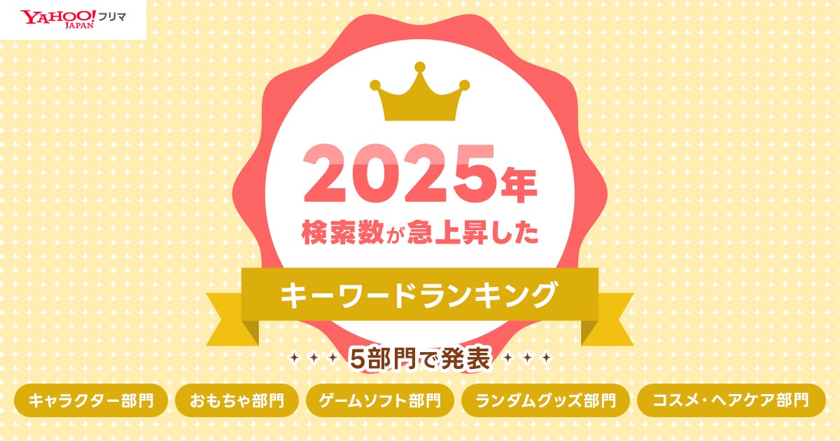 LINEヤフー株式会社(以下、LINEヤフー)が提供するフリマアプリ・サービス「Yahoo!フリマ」は、キャラクターやおもちゃ、ゲームソフト、ランダムグッズ、コスメ・ヘアケアの5部門において、前年と比べ検索数が急上昇したキーワードを集計(※1)し、「検索急上昇ランキング 2025」として公開します。