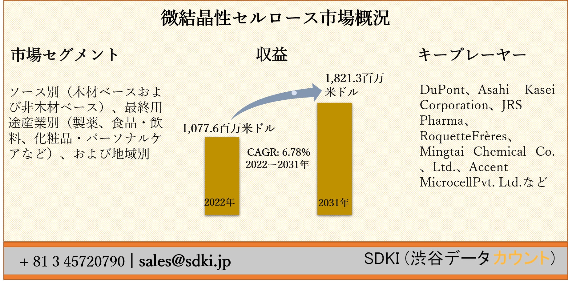 SDKI Inc.は、「世界の微結晶性セルロース市場ー予測2022ー2031年」新レポートを 2021年12月30日に発刊しました。この調査には、微結晶性セルロース市場の成長に必要な統計的および分析的アプローチが含まれています。レポートで提供される主要な産業の洞察は、市場の既存のシナリオに関する読者に市場の概要についてのより良いアイデアを提供します。さらに、レポートには、市場の成長に関連する現在および将来の市場動向に関する詳細な議論が含まれています。