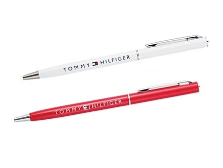 ロゴ入りのボールペンは、細めのフォルムが上品。白のペンには黒インク、赤のペンには赤インクがセットされています。インクが切れても替え芯の使用が可能。