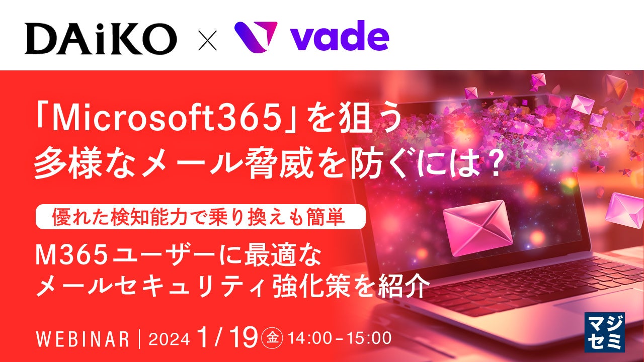 本セミナーは「Microsoft365環境におけるメールセキュリティの強化」をテーマとしてメールセキュリティにおける課題、攻撃の詳細などを解説します。さらに、セキュリティ強化の具体的な手段として、Microsoft 365と協調し強固なセキュリティを実現する「Vade for M365」をご紹介します。実際の検知の様子を交えて、API連携を活用した多層防御やAI技術の活用などの特徴、「設定や乗り換えの容易さ」などの導入メリットをご説明します。