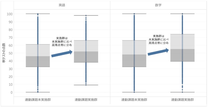単元別のつまずきの把握に特化した「到達度テスト」を行い、生徒一人ひとりのテスト結果に応じた学び直しの連動課題配信を実施することで学力向上を示唆。
