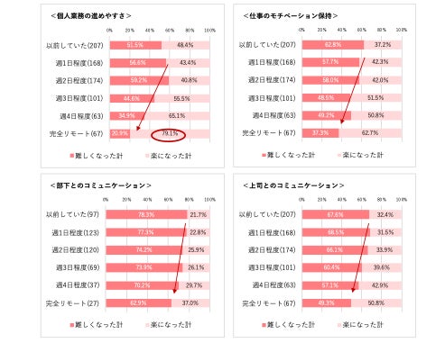リモートワーク経験のある20~50代の正社員に個人業務の進めやすさについて聞くと、「厳しくなった(51.5%)」、「楽になった(48.4%)」で約半々となった。仕事のモチベーション保持は、「難しくなった」が55.5%、「楽になった」が44.5%と「難しくなった」が上回った。また、部下とのコミュニケーションが「難しくなった」は74.8%、上司とのコミュニケーションが「難しくなった」は64.1%だった。特に対部下へのコミュニケーションが難しくなったと感じる人が多いようだ。【図7】