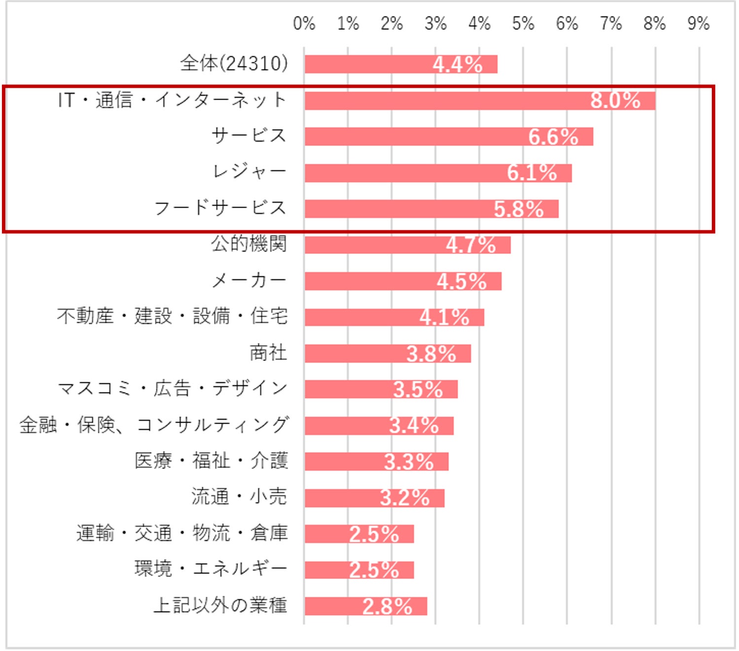 20~50代の正社員のうち、6月に転職活動をした人は4.4%、若年層ほど高く、20代では8.2%となった。業種別では、[IT・通信・インターネット][サービス][レジャー][フードサービス]従事者の転職活動が活発に行われていたようだ。【図4、5】