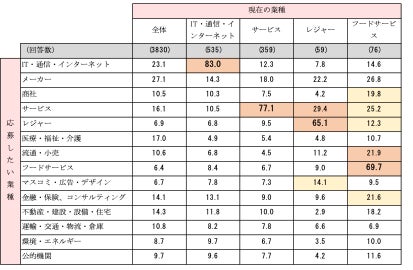 応募したい業種と現在の業種を比較すると、[IT・通信・インターネット][サービス]は同業種への応募希望が約8割と高い結果になった。また、[レジャー][フードサービス]も同じ業種への応募希望が最も高く7割弱だった一方で、他の業種に比べると異業種への応募希望も高く、幅広い業種で転職を検討している様子がうかがえる。【図6】