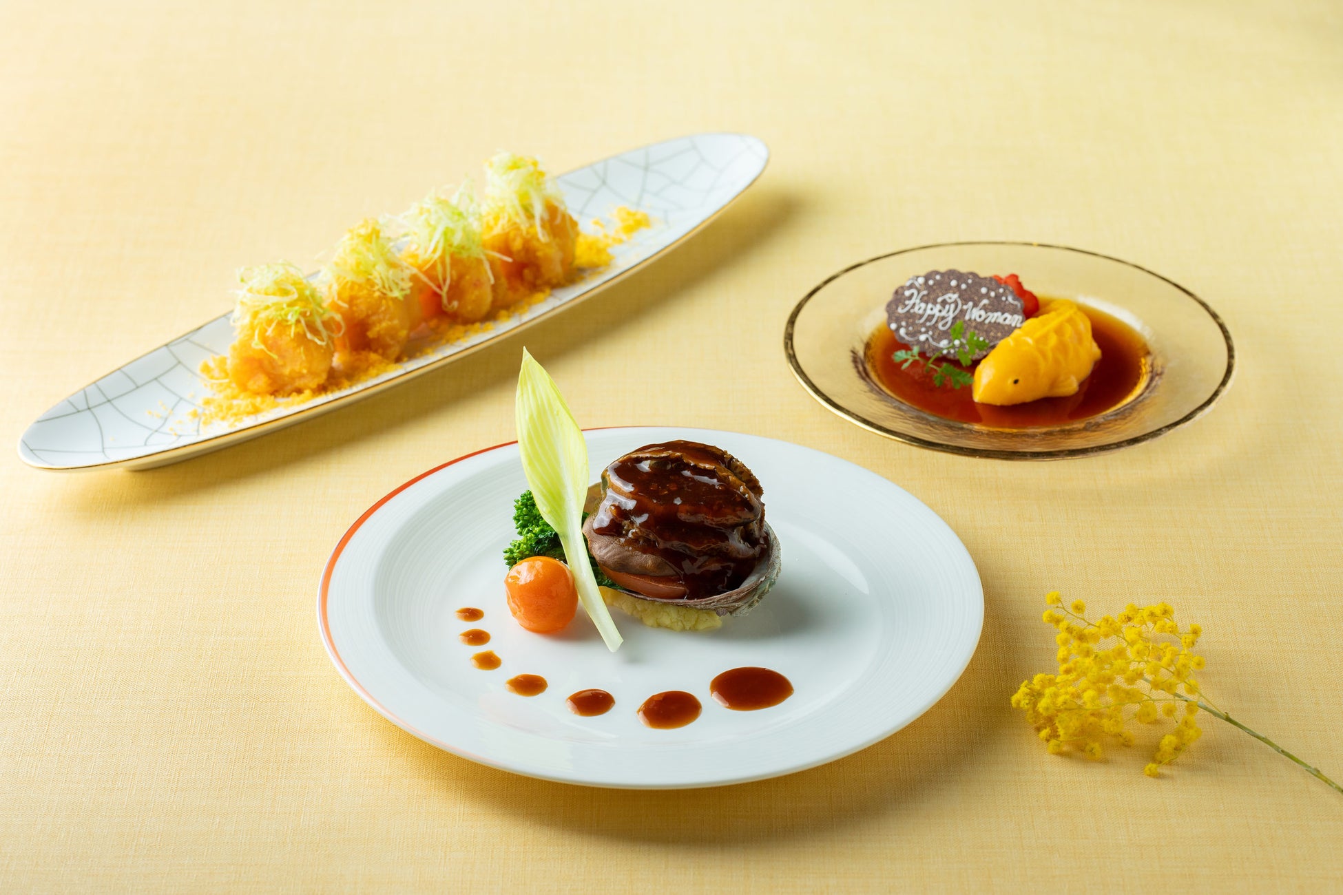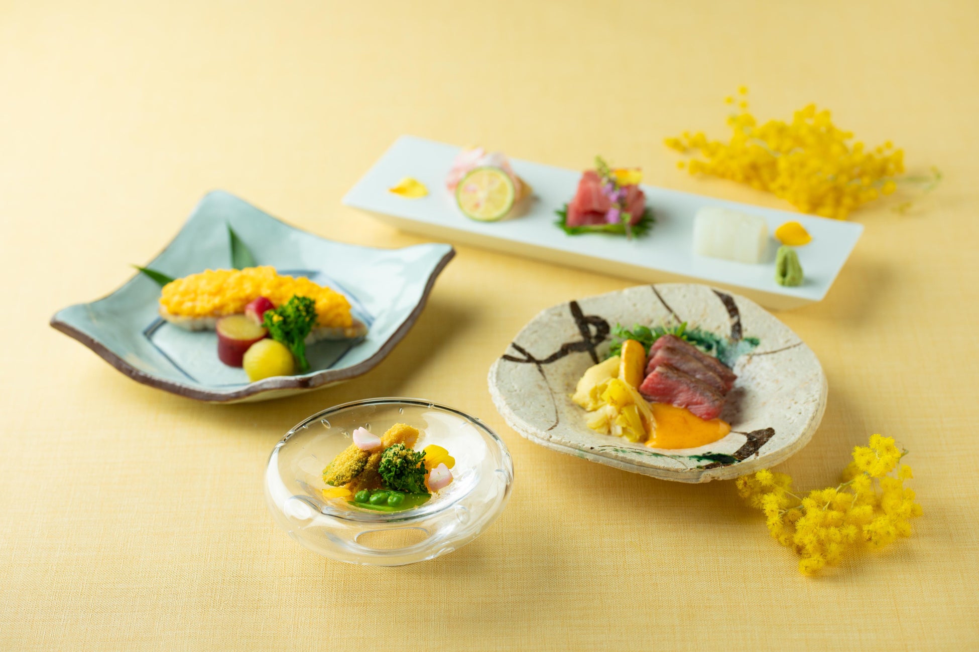春に旬を迎える春素材をふんだんに用い、黄色が華やかな会席料理を作りました。蕗の薹や菜の花をはじめとする春野菜や愛らしい花野菜、鰆などの食材に鮮やかな黄色をかけ合わせた特別な会席で、国際女性デーをお祝いします。