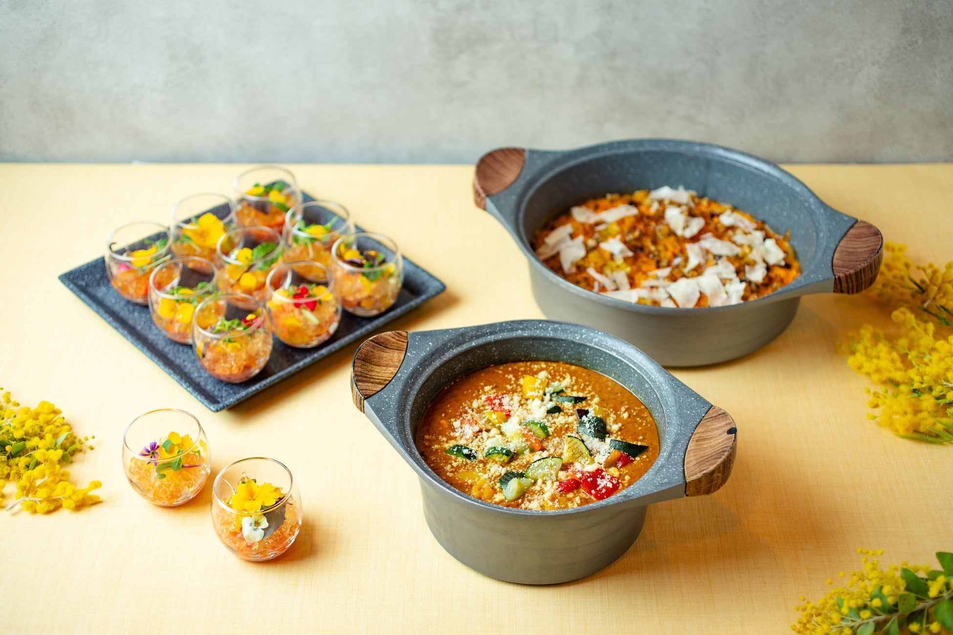 グランドブッフェにて、イエローが鮮やかな食材やサフランやターメリックなどのスパイスをつかい華やかに演出したお料理をご用意します。ランチブッフェとディナーブッフェでお楽しみいただけます。