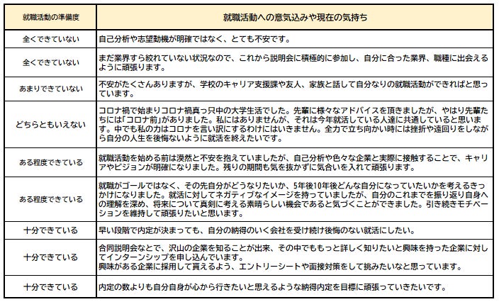 現時点の就職活動への準備度を自己採点してもらったところ、最多は「あまりできていない」で34.3%で前年比1.9pt減、「できている」は29.4%(「十分できている」と「ある程度できている」の合計)で前年比3.8pt増だった。就職活動に向けた意気込み・気持ちについて聞くと、「自己分析や志望動機が明確ではなく、とても不安」「まだ業界すら絞れていない状況なので、これから説明会に積極的に参加します」という声のほか、「内定の数よりも自分自身が心から行きたいと思えるような納得感のある内定が目標」や「早い段階で内定が決まっても、自分の納得のいく会社を受け続け後悔のない就活にしたい」のように、内々定の数ではなく、就職活動の内容にこだわりたいという抱負などが見られた。【図6、7】