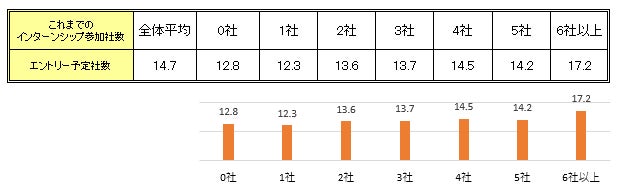 3月1日以降の平均エントリー予定社数は14.7社。インターンシップ参加社数が多い学生ほどエントリー予定社数も増加傾向に